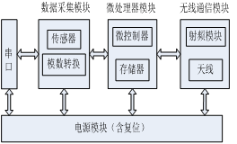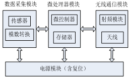 参考节点和移动节点的原理框图如图2所示。它们主要由传感器模块、数据采集模块、无线通信模块以及其